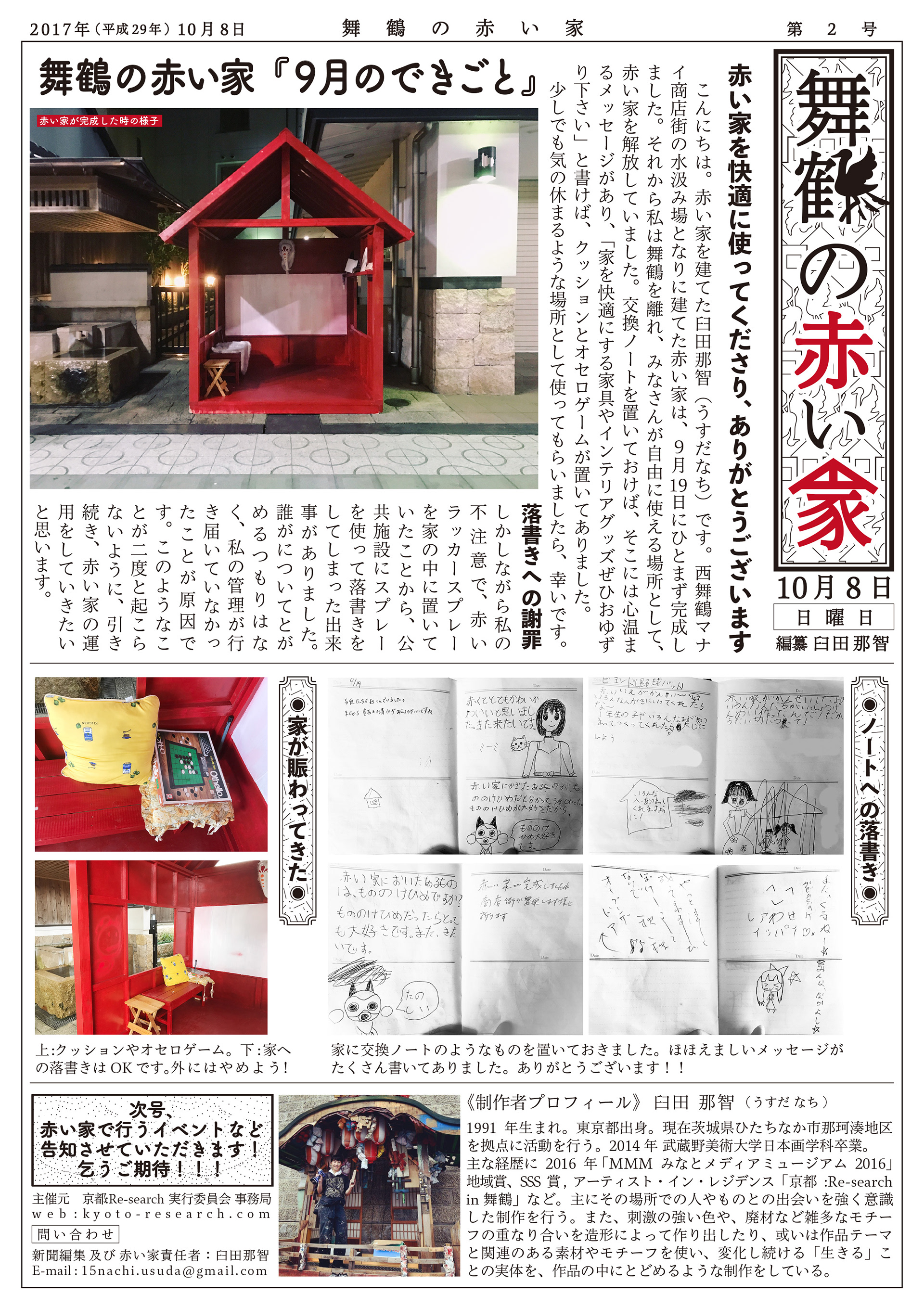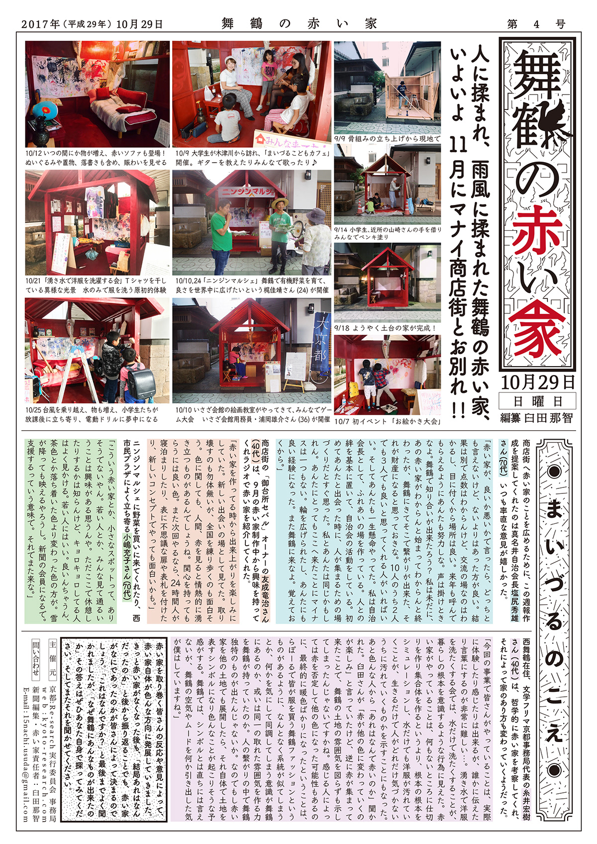 通りにむき出しの状態で制作を行っていたため、行き交う人には幾度となく「何が出来るんですか?」と声を掛けられ、家の使い道をどうしようか?と逆に質問してみたという。そこで返ってきた答えを実際に試してみる。そのようにして、唐突に出来た赤い家がどのように変わっていくか、どのように舞鶴に馴染んでいくか、或いはさらに違和感を帯びていくのか、その過程を含めた現象を、時には参加したり、外側から傍観したりしながら、楽しんでほしい。いずれにしても、赤い家をきっかけに誰かのたがが外れたら、もっと楽しいだろう。