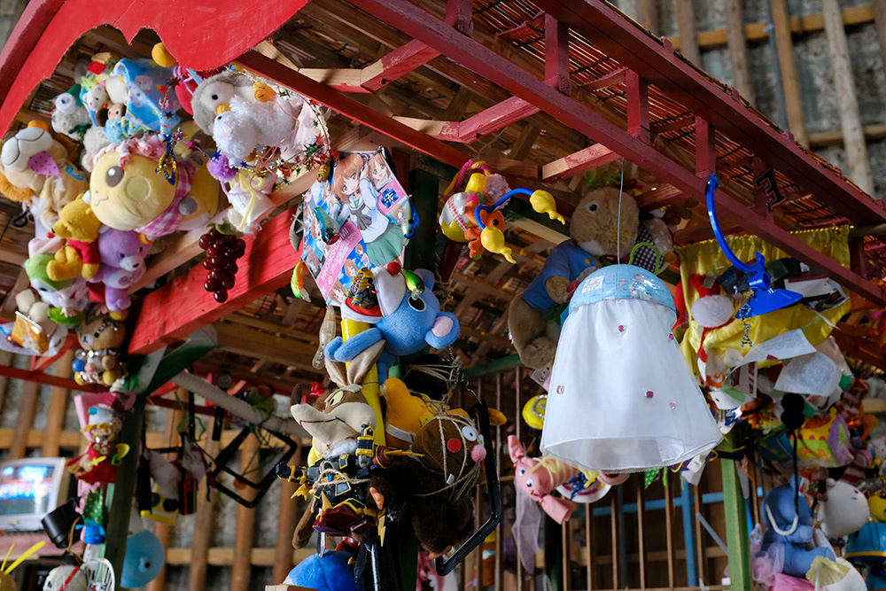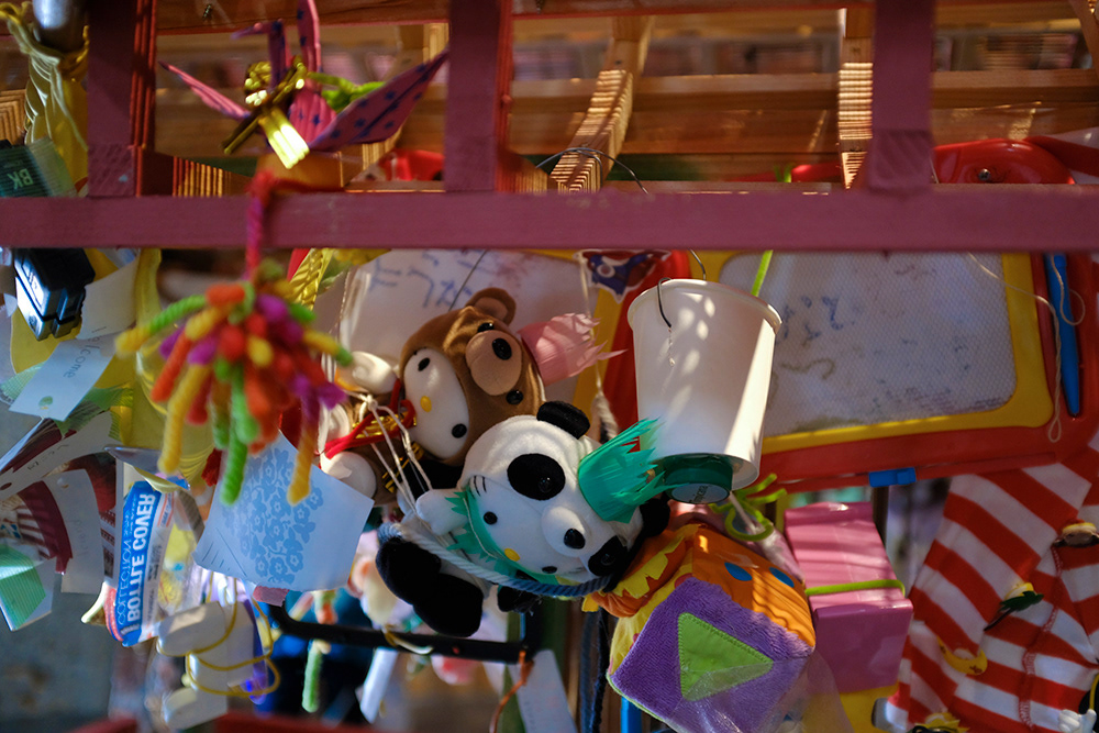 今年は、高校生から未就学児童までのあらゆる歳の子どもたちと楽しいことがやりたくて、子どもが引ける「子ども屋台」を作りました。そこへ装飾が物を言う屋台になぞらえて、子どもが要らないおもちゃを持ち寄り、数名のグループでそれぞれのおもちゃを合体させたオブジェを作りました。それをMMM学生スタッフの大学生から、那珂湊の高校、中学校、小学校で行い、そこで出来上がったたくさんのオブジェを、八朔祭り1日目の8月5日には那珂湊駅にて、子どもたちとともに屋台に飾りつけました。