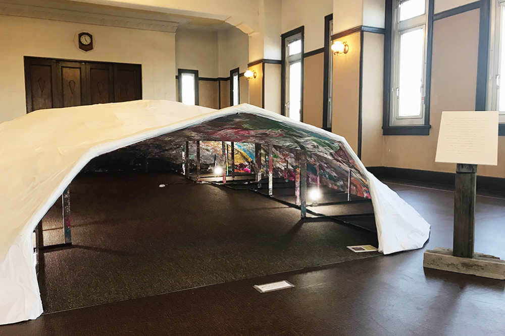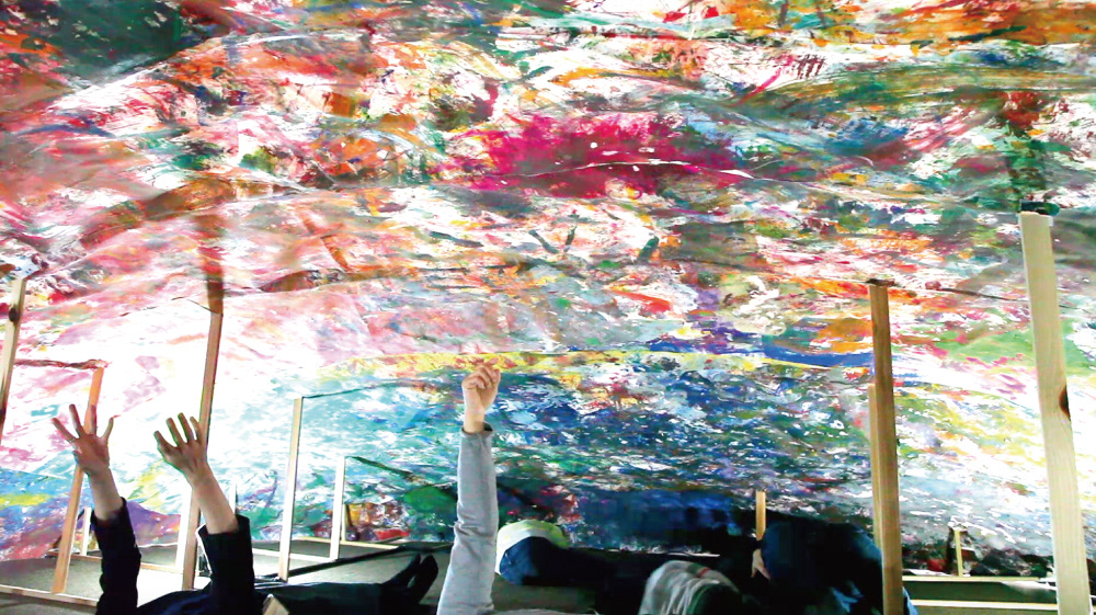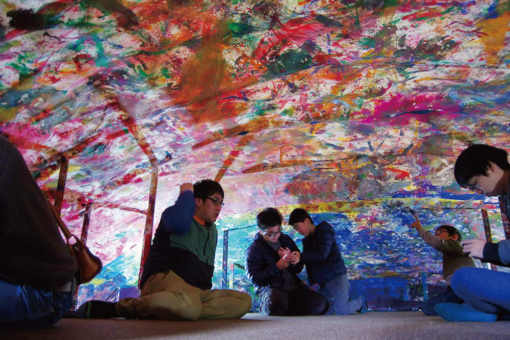 そして彼らの力強いパワーに浸り、色と色が重なる美しさを堪能できるような空間を作る、その仕掛けとして、「寝ながら夜空を眺めるように絵を眺める」鑑賞方法を作ることにした。