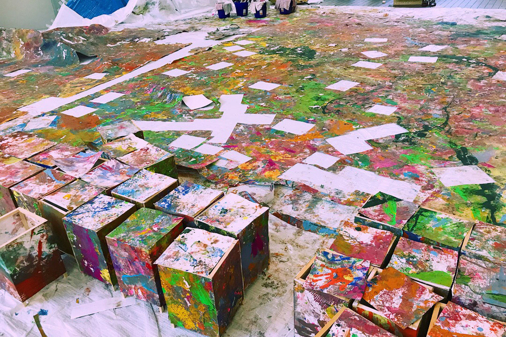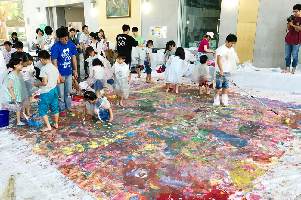 10人あまりの大人数で一斉に描くため、白い画面がみるみるうちに鮮やかな色彩に変わり、色とりどりの足跡や手形も加わった。