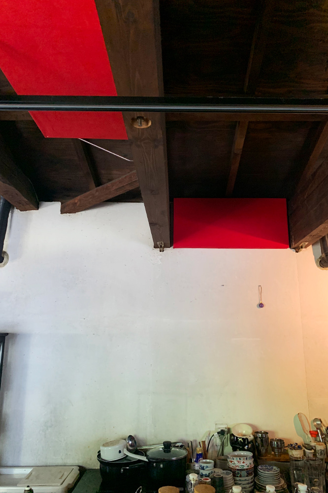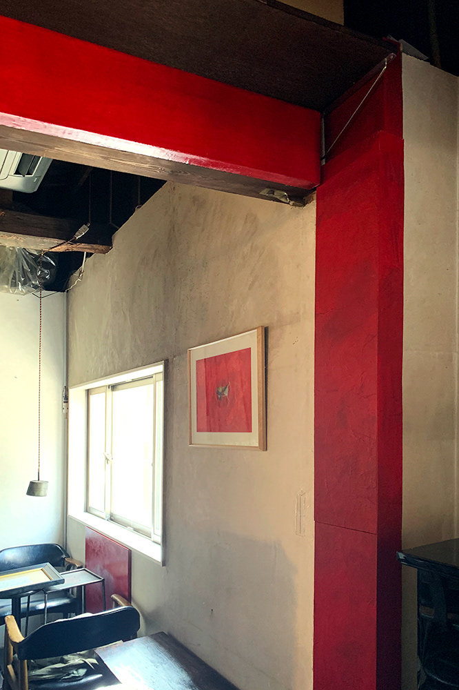 赤いアートピースを喫茶まるなの店内(窓ガラス、ガラスケースの鏡、写真作品の額縁の側面、壁の溝など計15箇所)至る所に「さりげなく」当てはめた。赤本来の持つ強烈な色彩が、「さりげなさ」の中にいかに存在の強さを発揮し、喫茶まるなの空間に影響していくか、実験的な試みであった。